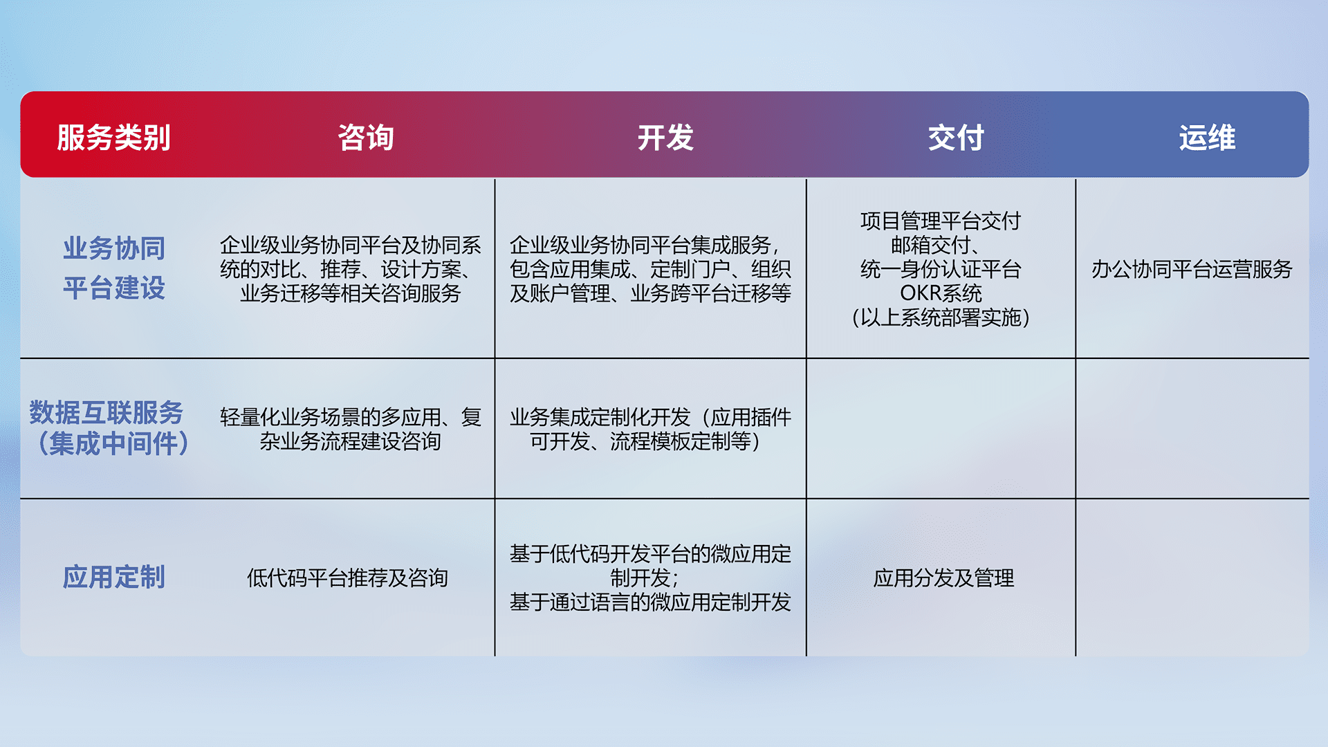 针对钉钉、、、企微、、IDaas等平台级产品提供产品的规划、、、方案、、、、交付、、、、定制化开发等服务,,,,实现如统一协同办公、、智能客户服务、、、混合会议管理、、、、智能数据查询、、、等业务场景,,,,实现数字化转型。。。。